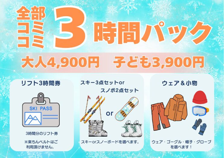 リフト券3時間&レンタルすべて揃ってこのお値段!スキーの最初の一歩が断然お得にスタートできます♪