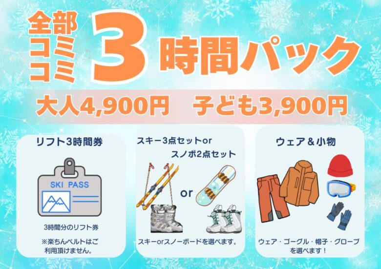 | 3時間パック券 (リフト3時間+レンタルセット3時間) | 3,900円 |